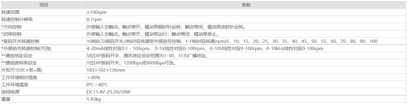 T100系列ODM蠕動(dòng)泵驅(qū)動(dòng)器由57步進(jìn)電機(jī)選配多種控制方式形成的體積小、結(jié)構(gòu)簡(jiǎn)單、控制簡(jiǎn)便的蠕動(dòng)泵驅(qū)動(dòng)器產(chǎn)品系列。主要在設(shè)備、儀器中配套使用,實(shí)現(xiàn)430mL/min以下的流體傳輸。采用撥碼開關(guān)結(jié)合外部信號(hào)的控制方式,外部信號(hào)可選4-20mA、0-5V、0-10V、0-10kHz,并可提供采用RS485通訊控制方式的產(chǎn)品。采用底板、面板兼容的安裝方式。