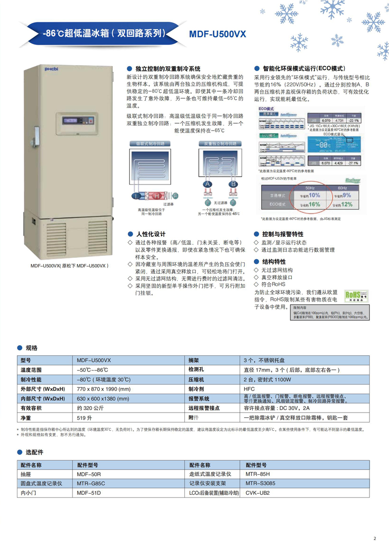 新設計的雙重制冷回路系統(tǒng)確保安全地貯藏貴重的生物樣本。該系統(tǒng)由兩臺獨立的壓縮機構(gòu)成,可提供穩(wěn)定的-80℃超低溫環(huán)境。即使其中一條冷卻回路發(fā)生了意外故障,另一條也可維持最低-65℃的溫度。級聯(lián)式制冷回路:高溫級低溫級位于同一制冷回路雙重獨立制冷回路:一個壓縮機發(fā)生故障,另一個 能使溫度保持在-65℃