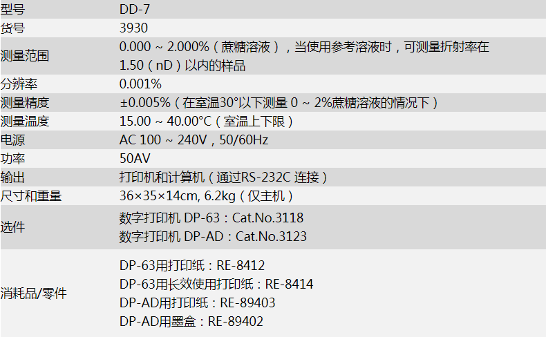 測量精度 | ±0.005%(在室溫30°以下測量0~2%蔗糖溶液的情況下) |