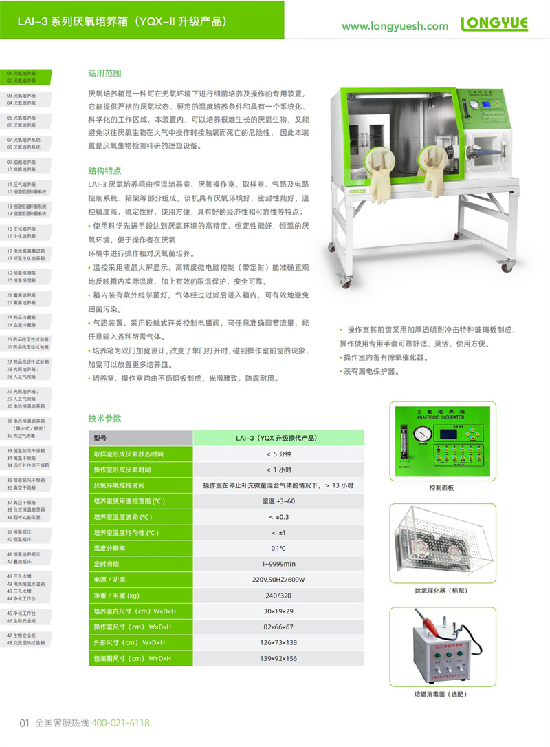 LAI-3 厭氧培養(yǎng)箱由恒溫培養(yǎng)室、厭氧操作室、取樣室、氣路及電路控制系統(tǒng)、箱架等部分組成。該機(jī)具有厭氧環(huán)境好,密封性能好,溫控精度高,穩(wěn)定性好,使用方便,具有好的經(jīng)濟(jì)性和可靠性等特點(diǎn)。