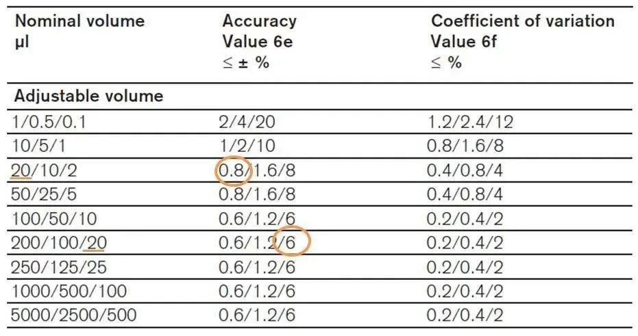 移液操作通常為反向移液,對(duì)于低濃度樣本盡可能增加重復(fù)以防止低分子隨機(jī)性因素導(dǎo)致結(jié)果不穩(wěn)定,高濃度探針引物稀釋后移液可以減少批間誤差。以手動(dòng)單道移液器為例(如圖5),同樣是移取20 μl液體,選擇量程是20 μl的移液器時(shí)精度≤±0.8%,換算成體積為±0.16μl;而選擇量程是200μ的移液器時(shí)精度為≤±6%,體積偏差在±1.2μl 。