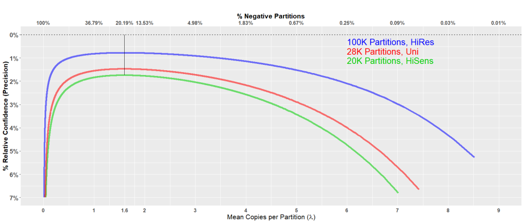 分散過(guò)程中的誤差分析:統(tǒng)計(jì)學(xué)樣本濃度均值λ,即平均一個(gè)分區(qū)單元包含λ個(gè)拷貝不一定剛好是真實(shí)模板濃度,需要結(jié)合置信區(qū)間和置信水平表示,數(shù)字PCR中置信水平通常是95%,而針對(duì)置信區(qū)間科研和商業(yè)化公司有多種計(jì)算方式。